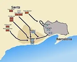 The Catalan rebels had taken up position on the heights of Montjuïc which dominated the city of Barcelona. The Spanish launched several concerted attempts to capture Montjuïc Castle, but were continually repulsed. Finally a large force of Catalan rebels counter-attacked from the direction of Barcelona. Large numbers of Spanish troops were killed and the remainder had to withdraw to Tarragona along the coast.