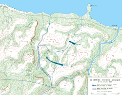 On 13 January, the 2nd and 8th Marine regiments began their offensive with the 8th Marines attacking along the coast and the 2nd Marines advancing further inland. The Japanese were pushed back in some places but held in others, with heavy fighting occurring at several locations in the hills and ravines near the coast. On 14 January, the 2nd Marines were relieved by the 6th Marine Regiment under the command of Colonel Gilder D. Jackson.[65]