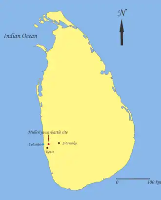 The Battle of Mulleriyawa (Sinhala: මුල්ලේරියාව සටන) in 1559 was part of the Sinhalese–Portuguese War. It was one of the most decisive battles in Sri Lankan history and considered as the worst defeat of the Portuguese during that period. According to local chronicles, the marshlands of Mulleriyawa turned red with blood after the annihilation of the Portuguese.[6] With this victory, Sitawaka emerged as a military power which was able to challenge the Portuguese expansion.