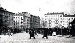 On the night of April 19–20, the command of the ŻZW held a meeting, during which it was decided to distribute the reserve of weapons among all the insurgents, so that it would not fall into the hands of the Nazis in case they acquired the arsenal.[14] Heavy fights continued over the next few days, and when Jürgen Stroop took command of the Nazi army, they became even more intense as the Germans used tactics of destroying individual houses, burning and bombing them using heavy cannons. The insurgents, using hidden passages between the houses, attacked Germans by surprise, but at the same time they lost all communication and could only contact each other at night. On the fourth day of the fights, the Muranów unit was joined by a group of ŻZW from the "shop" of brushers in Świętojerska Street, which was captured by a German armored unit.[16] According to Wdowiński, on the fifth day of the uprising, the flag was still on the command building at Muranów Square, and the insurgents were still defending themselves by shooting from the windows.