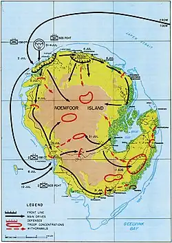 By 20 June, Japanese forces on Biak had been largely defeated and construction work began on the Mokmer airfield, which was operational two days later.[12] Bombing of the Noemfoor by the United States Army Air Forces (USAAF) and Royal Australian Air Force (RAAF) began as early as April 1944.[13] Between 20 June and 1 July, Allied bombers dropped 800 tons of bombs on the island.[14]
