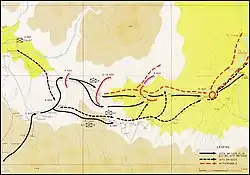 Several frontal assaults by the 16th Brigade, the lead Australian brigade, around Oivi were repulsed over several days with the Australians being subjected to heavy artillery fire,[13] until the Australian divisional commander, Vasey, decided to launch a flanking move towards Gorari, determining that in the circumstances he could afford to move the 25th Brigade forward from Kokoda, leaving it largely undefended.[18] After stockpiling stores, the attack was commenced.[11] Two battalions – the 2/2nd and 2/3rd Infantry Battalions, as well as the Militia 3rd Infantry Battalion – pinned the Japanese defenders in place around Oivi, while the 2/1st, detached from the 16th, carried out a flanking move with the three battalions of the 25th Brigade – the 2/25th, 2/31st and 2/33rd Infantry Battalions – which were sent on a wide flanking move around Gorari by way of Kobara and Komondo.[19][11][20]