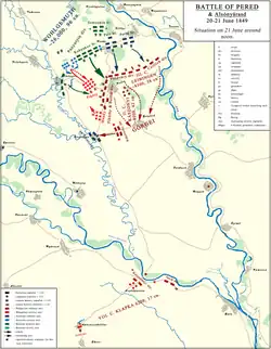 On 16 June, Colonel Lajos Asbóth, the commander of the II. corps, with around 8000 soldiers, started an attack towards Pered, but, despite initial successes, in the Battle of Zsigárd suffered a defeat, mainly because of the III. corps led by Major General Károly Knezić, which did not come to his rescue.[24] The attack of the I. corps led by Major General József Nagysándor against the Austrian entrenched encampment from Sempte, but he too suffered a defeat.[24] At the same time a Hungarian division advanced to Csilizpatas, but they stopped there.[24] The only success of those actions was the building, by one of the II. corps detachments, of a bridge across the Vág river. This bridge served in the ensuing battle of Pered, an important role for the movement of their troops.[25] Hearing about these defeats, Görgei decided to repeat the attack on Pered, but with more troops.[24] Görgei had the following troops to attack the imperial army at his disposition: the I., II., III. corps and a part of the VIII. corps, which were a totally of 32,907, or according to other sources 31,348 soldiers, with 143 batteries.[1] In the meanwhile on 19 June, Haynau ordered his troops to cross the Danube for the general attack on the southern bank of the Danube against Győr, but to hide his plans, ordered his troops which were still on the northern banks, to repulse the Hungarian attack on the Vág's valley.[26] So he ordered the II. corps together with the reserve (IV.) corps to occupy the banks of Vág, making a bridgehead at Sempte. On 18 June Wohlgemuth installed his headquarters at Galánta.[27] At the same time, he sent the Panyutyin division, from Szenc to Diószeg to support the reserve corps.[26] Wohlgemuth planned an attack with the Pott and Theissing brigades against the Hungarian forces from the region of the lower Vág, but first, he wanted to know the strength of the Hungarians in that region.[27] So, on 18 June the Pott and the Theissing brigades of the II. corps received the order to do a reconnaissance-in-force towards Alsószeli,[26] and after carrying out this, they reported 18,000-20,000 Hungarian soldiers in the region, which made Wohlgemuth postpone the planned attack until more Austrian troops arrive.[27] On 20 Wohlgemuth planned with these two brigades to advance towards Negyed and Királyrév, to learn more precise pieces of information about the enemy when the Hungarian attack started.[26] At the military council held on 19 June in Zsigárd with Herzinger and Pott, Lieutenant General Wohlgemuth decided that in the case of a Hungarian attack from the south, Pott would not defend the village for long, but would retreat to Pered, where he would join forces with Herzinger to stop the Hungarian Hungarian troops. To this end, Pott's brigade was temporarily reinforced with the 5th cuirassier regiment and with the 2nd cavalry artillery battery.[28]