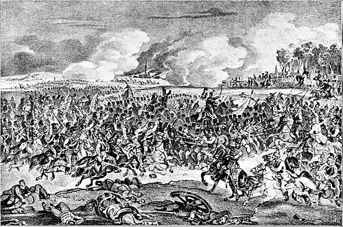 The superior Hungarian artillery won the duel with the Austrian cannons, then covered the infantries and cavalry's attack.[37] The Austrians tried to withstand the attack of the Hungarians, but when the Pozsony jäger company and the Bereg volunteer company occupied without much resistance Királyrév from the Austrian garrison,[27] while the 49. battalion attacked the right edge of Zsigárd, the 63. battalion entered it from the southwest, while the infantry of the Rakovszky detachment from the southeast the 58/1 Landwehr battalion, which was forced to retreat.[37] Noticing that the Hussars try to encircle Zsigárd, Pott gave the order to retreat towards Pered, which task was carried out in order.[37] But the 3. company of the Landwehr battalion which defended the eastern part of the village for too long, was encircled, and nearly all its soldiers fell prisoner.[37]
