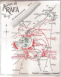 The plan for the attack at Rafa the next morning, 9 January, was a repetition of Chauvel's successful encirclement attack at Magdhaba. The regiments and motor cars would surround the Ottoman garrison position, gallop up under fire, then dismount to attack the defenders in their treble system of trenches and field-works around the earthwork redoubts on the knoll.[6]
