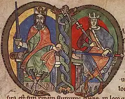 Another possibility is that Somairle was attempting to secure a swathe of territory that had only recently been secured by the Scottish Crown.[106] Although there is no record of Somairle before 1153, his family was evidently involved in an earlier insurrection by Máel Coluim against David that ended with Máel Coluim's capture and imprisonment in 1134.[82][note 13] An aftereffect of this failed insurgency may be perceptible in a Scottish royal charter issued at Cadzow in about 1136.[116] This source records the Scottish Crown's claim to cáin in Carrick, Kyle, Cunningham, and Strathgryfe.[117] Historically, this region appears to have once formed part of the territory dominated by the Gall Gaidheil,[118] a people of mixed Scandinavian and Gaelic ethnicity.[119] One possibility is that these lands had formerly comprised part of a Gall Gaidheil realm before the Scottish Crown overcame Máel Coluim and his supporters.[116] The Cadzow charter is one of several that mark the earliest record of Fergus, Lord of Galloway,[120] a Scandinavian-Gaelic magnate who held lands in Carrick. Fergus' attestation could indicate that, whilst Somairle's family may have suffered marginalisation as a result of Máel Coluim's defeat and David's consolidation of the region, Fergus and his family could have conversely profited at this time as supporters of David's cause.[116] The record of Fergus amongst the Scottish elite at Cadzow is certainly evidence of the increasing reach of David's royal authority in the 1130s.[121]