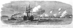 They then moved up Croatan Sound, where they were divided; some were ordered to fire on the fort at Pork Point (Fort Bartow), while others were to concentrate their fire on the seven vessels of the Mosquito Fleet. At about noon, the bombardment began.[23]