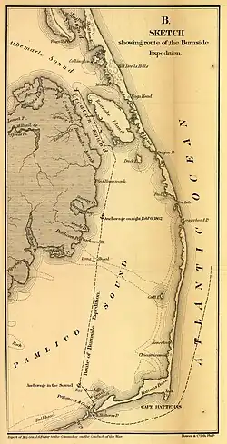 Sketch showing route of Burnside's forces to Hatteras Inlet. U.S. Government Printing Office, 1866