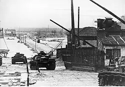 By 17 October 1941 the Mius River was crossed by the 14th Panzer Division and Taganrog was captured by German troops, with the mountain troops entering Stalino, forcing the newly formed 12th Army into a renewed withdrawal. However, the autumn rains had begun, and the Rasputitsa ("roadlessness") had set in slowing the 1st Panzer Army's advance to "meter by meter".[7] This meant that the leading German units did not reach the outskirts of Rostov until mid-November, having lost contact with the Red Army in the meantime.[8]