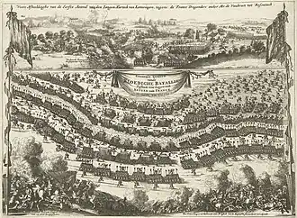 In January 1674, Denmark–Norway joined the anti-French coalition, while the February Treaty of Westminster ended the Third Anglo-Dutch War.[2] After completing the reconquest of Franche-Comté in June, the main French army under Condé won a narrow victory over a combined Dutch-Spanish force under William of Orange at Seneffe in August.[3] However, French losses were so high Condé was ordered to remain on the defensive.[3]