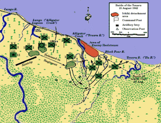 The Battle of the Tenaru, sometimes called the Battle of the Ilu River or the Battle of Alligator Creek, was a land battle between the Imperial Japanese Army and Allied ground forces that took place on 21 August 1942, on the island of Guadalcanal during the Pacific campaign of World War II. The battle was the first major Japanese land offensive during the Guadalcanal campaign.