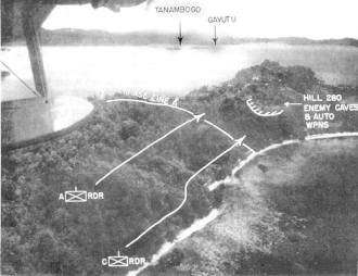 Surviving Marines were able to deploy two M1919 Browning machine guns to provide suppressive fire on Gavutu's caves, allowing more Marines to push inland from the landing area. Seeking cover, the Marines became scattered and were quickly pinned down. Captain George Stallings, the battalion operations officer, directed Marines to begin suppressive fire with machine guns and mortars on the Japanese machine gun emplacements on Tanambogo. Shortly thereafter, American dive bombers dropped several bombs on Tanambogo, diminishing some of the volume of fire from that location.[37]