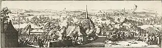 Despite his troop's failure to overcome Hodges' small force, Humières decided to attack Walcourt itself, which had since been occupied by 600 men. The ground was not favourable to the French – although the defences of the town were antiquated, it stood on a hill partly covered by a river.[14] Nevertheless, several attacks were pressed home, but the French suffered heavy casualties from the Allied enfilading guns. Despite the losses Humières persisted, and sent a party of Gardes Françaises to try to set alight Walcourt's gates. The attempt failed, and the safety of the garrison was assured after Brigadier-General Thomas Tollemache brought the Coldstream Guards and a German Battalion into the town around 14:00.[13]