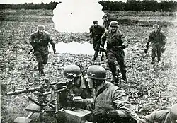 As planned, the Luftwaffe flew over the Netherlands in the early morning hours of 10 May, but rather than deceiving the people of The Hague, their passage alarmed them.[6] A different group of German airplanes flew directly to The Hague and at 04:00 bombed the New Alexander Army Barracks and the adjacent Waalsdorp Army Camp, and 66 and 58 men were killed respectively. The other German air group circled back from the sea and bombed the airfield at Ypenburg at approximately 04:15. Immediately thereafter, transport planes began dropping paratroopers in several waves onto the field and its surroundings, but Dutch machine gun fire inflicted casualties and scattered their landings. Many planes were forced to land either damaged or destroyed by the defenders, which blocked further arrivals. German troops attacked and occupied the airfield's main building and raised the German flag to signal victory. However, the Dutch managed to prevent the Germans from advancing beyond Ypenburg to enter The Hague.[7][8][5][9]