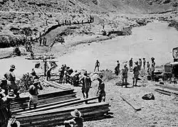 The 21st Australian Brigade advanced along the coast road heading for Beirut and attempted to cross the Litani River. A surprise night time landing by the British No. 11 (Scottish) Commando, under the command of Lieutenant Colonel Richard Pedder (Highland Light Infantry), was attempted in order to seize the bridge near the mouth of the river, but was delayed by rough seas on the proposed landing beach. This gave the Vichy French defenders enough time to destroy the bridge. When the commandos eventually landed in daylight, in three separate places, the initial landing was almost unopposed due to the defenders being in combat against the Australian troops,[2] subsequently in the fighting they took heavy casualties, among them Pedder, who was killed in an assault on the French barracks. He was succeeded in command by Geoffrey Keyes, whose party was ultimately able to secure the crossing by getting over the river in canvas boats with the help of some of the Australian troops.[3]