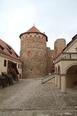 In a treaty of alliance in 1559, the Livonian Order passed sovereignty of the town and the castle to Poland.[6] Archbishop of Riga Wilhelm von Brandenburg was in possession of the castle when the Livonian Order collapsed in 1562, and the castle was turned over to Gotthard Kettler when he became the first Duke of Courland,[6] and it became one of the main ducal residences.[7] In 1568, 1590 and 1601 the Landtags of Duchy of Courland and Semigallia were held here.[6] Under Duke Friedrich, a new wing was added in 1590 with additional expansion in 1599, creating a modern residence with two massive round towers.[6][8]