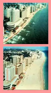 In many coastal areas, the economic impacts of a wide beach can be substantial. Since 1923, the U.S. has spent $9 billion to rebuild beaches.[16] One of the most notable example is the 10 miles (16 km)–long shoreline fronting Miami Beach, Florida, which was replenished over the period 1976–1981. The project cost approximately US$86 million and revitalized the area's economy.[17] Prior to nourishment, in many places the beach was too narrow to walk along, especially during high tide.