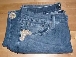 Three basic methods may be used to embroider with beads: individual beads may be sewn directly onto fabric, or several beads may be run through a needle before running through the backing, or else a line of threaded beads may be laid upon a fabric and secured with couching stitches.[3] Many people use a needle and thread to stitch beads to the fabric, usually a fine needle with a small eye to facilitate easier passage through the small holes in many seed beads. A second technique uses a fine hook to chain stitch thread to the fabric; in Europe this technique is known as Tambour[4] or Luneville[5] embroidery, and is commonly used to bead haute couture garments. In India the work is called Zari or Moochi Aari,[6] or just Aari [7] and is used on garments and furnishings. A hallmark of Tambour or Luneville embroidery is that the beads are attached on the underside of the fabric and the chain is formed on the top side of the fabric, whereas in Zari and Aari work, the beads are attached to the top side of the fabric where the chain stitch is formed. In Zari/Aari work the thread is hooked through each bead as the stitches are formed. The Tambour/Aari beading methods appear more difficult to master for those more used to working with a threaded needle but do have an advantage in speed over stitching beads with a needle, increased speed is possible as the thread is used from the spool so is continuous, there is no need to fasten of, cut new thread, thread the needle, and fasten on, secondly With Tambour/Luneville work the beads are strung direct on the thread before stitching begins, so no time is lost placing each bead on the needle. There are multiple YouTube videos examples demonstrating Arri/Zari stitching, and numerous books which instruct on Tambour or Luneville work.[8] Most beading onto fabric is worked with the fabric stretched tightly over a frame,[9] this holds the fabric tight and provides a flat surface to work the embroidery on, beads can add significant weight so some support is important. Using a frame means the embroiderer has both hands free for working. In Tambour or Luneville work the frame is often supported between two tables, above a table or on trestle supports and used when seated on a chair. In Aari or Zari work the frame is often closer to the ground, and used while seated on the ground.[6] Lesage is acclaimed in the fashion world for the beaded embroideries worked for many well known fashion designers.[10]