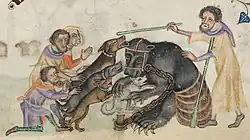 Variations involved other animals being baited, especially bulls. Bull-baiting was a contest which was similar to bear baiting in which the bull was chained to a stake by one hind leg or by the neck and worried by dogs. The whipping of a blinded bear was another variation of bear-baiting.[6] Also, on one curious occasion, a pony with an ape tied to its back was baited; a spectator described that "... with the screaming of the ape, beholding the curs hanging from the ears and neck of the pony, is very laughable".[7]