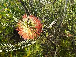 The flowers are red and green and are arranged in bottlebrush-like spikes about 40 mm (2 in) in diameter and 60 mm (2 in) long on the ends of branches which continue to grow after flowering. The flowers have 5 sepals, 5 petals and 5 bundles of stamens. The stamen bundles contain 3 to 7 stamens, are green in their lower half and red in the upper and joined for about half of their length. Flowering occurs from August to January and is followed by fruits which are woody capsules in roughly spherical or cylindrical clusters.[2][4][5][6]