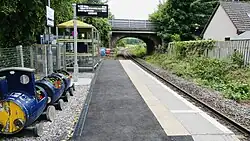 Following a local campaign, the station was reopened on 15 April 2002.[4] A new single platform, shelter and car park were built in a £250,000 project.[12] The platform is the shortest in Great Britain: at the length of 15.06 metres (49 ft 5 in),[13] it is shorter than a single carriage of a Class 158 train that is usually used on this line. The platform's length only allows for a single door on the train to be opened, most frequently it is the frontmost door.