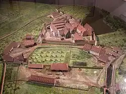 Bebenhausen Abbey was established around 1185, when Rudolph I, Count Palatine of Tübingen,[1][2] donated Bebenhausen, then an abandoned village on the edge of the Schönbuch, to the Premonstratensian Order. Monks from Marchtal Abbey,[2] another of Rudolph's endowments,[3] settled in the village. It was with this company that the monastery was first documented in mid-1187, but the Premonstratensians abandoned the monastery later in the decade. Rudolph next gave Bebenhausen to the Cistercian Order, whose General Chapter at Cîteaux Abbey decided in 1190 to accept it and directed the Abbot of Schönau Abbey to establish a new monastery. In response, Rudolph granted the Cistercian project the freedom of not having to recognizing a vogt, a noble charged with lordship over and protection of a monastery, in mid-1211.[2] The church of the new monastery was consecrated in 1228 by the Bishop of Constance.[4]