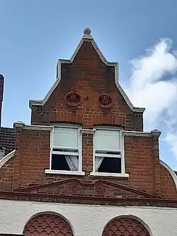 Characteristic features of the houses are red brick, walls hung with tiles, gables of varying shapes, balconies, bay windows, terracotta and rubbed brick decorations, pediments, elaborate chimneys, and balustrades painted white.[12] The eclectic approach is well seen in the estate church of St Michael and All Angels, where Shaw has incorporated Arts & Crafts, Georgian, medieval, Tudor, and Wren styles.[1]