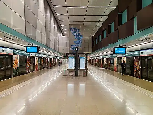 The station features Somewhere Else by Ng Chee Yong as part of the MRT network's Art-in-Transit programme, a public art showcase which integrates artworks into the MRT network. Alluding to the namesake reservoir, the artwork intends to depict the relationship between water flow and human traffic in the station. Besides a stylized bench, the artwork features a message on the lift shaft: "What matters is not where you're going but where your dreams are headed" cast in light blue, which, according to writer Justin Zhuang, "dribbles down" the shaft in motifs of droplets that "flow" on the platform to the exit.[17][18][19] The message was a phrase that Ng hoped to remind commuters how far they are from their dreams.[20]