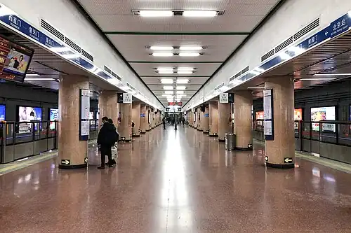The Beijing station equipment was considered to be relatively advanced at its -time with four AC2-59 type escalators installed in the interior; the joint design and production of the escalators were coordinated by the Shanghai Jiao Tong University and Shanghai Elevator Company.[5] The four sets of escalators were replaced during the 1980 and again during 1990; the most recent replacement of the elevators occurred in early 2005 - the design being a product of Otis Company.[6]
