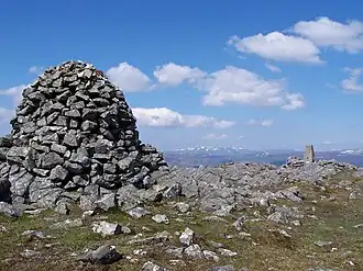The summit with the large cairn and trig point with Ben Alder in the distance.