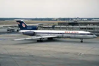 The early 1960s brought further expansion. In 1962, the Antonov An-12 began operating on the Moscow-Minsk route. This period saw an increase in air travel, with 530,000 passengers departing from Belarusian airports that year — a 7.6-fold increase since 1958.[19] The growth continued with the introduction of the Tupolev Tu-124 on Belarusian routes in 1964.[20] By 1965, the total length of the republic's air routes had expanded to 17,500 kilometers.[21] Further modernization of the fleet occurred in 1967 with the introduction of the Antonov An-24 on the Minsk-Gomel route.[22] By 1970, Belarusian aviators expanded their reach, flying 35 routes of Union importance and an additional 67 within the republic. That year, a new route to East Germany was opened.[23] The fleet continued its modernization in 1972 with the introduction of the Yakovlev Yak-40.[24] With the adoption of the Tupolev Tu-134, Belarus became recognized as the primary center of expertise for this aircraft within the Soviet Union.[25] The fleet was further expanded in 1983 with the addition of the Tupolev Tu-154.[26]