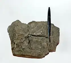 Belemnites is a genus of an extinct group of cephalopods belonging to the order Belemnitida. These cephalopods existed in the Early Jurassic period from the Hettangian age (196.5–199.6 mya) to the Toarcian age (175.6–183.0). They were fast-moving nektonic carnivores.