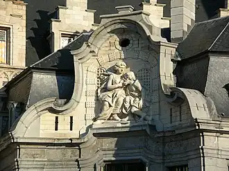 A small annex dating from 1741, called the Mammelokker, served as the entrance and guard's quarters of the city jail that occupied part of the old cloth hall from 1742 to 1902. The name refers to the sculpture of Roman Charity poised high above the front doorway. It depicts the Roman legend regarding a prisoner called Cimon. Cimon was sentenced to death by starvation, but survived and ultimately gained his freedom thanks to his daughter Pero, a wet nurse who secretly breastfed him during her visits. Her act of selflessness impressed officials and won her father's release. The term 'mammelokker' translates as 'breast sucker'.[8]