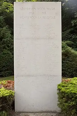 During the First World War, around 33,000 Belgian soldiers fled to the neutral Netherlands after the Belgian city of Antwerp fell to the German troops in 1914. In compliance with the 1907 Hague Convention, the military refugees were disarmed and interned by the Dutch. Through the influx of refugees, Harderwijk, where a refugee camp was located, tripled its population.[1] Most of the victims buried at the Belgian Military Field of Honour died of tuberculosis, or the 1918–1919 outbreak of the Spanish flu. Therefore, many of the 349 soldiers died in 1918 or 1919. Other buried refugees include six victims of the uprising at camp Zeist in Soesterberg on 3 December 1914, when the interned refugees revolted against the bad living conditions in the camp, provoking the Dutch guards to violently suppress the uprising.[2]