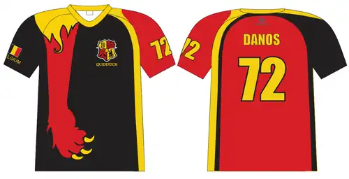 The colours of the team have always been that of the Belgium tricolore, red, gold and black. Since in quidditch it is illegal to sport a jersey primarily with yellow due to confusion with snitches, the primary colours are always red or black with yellow as a flair.[7]