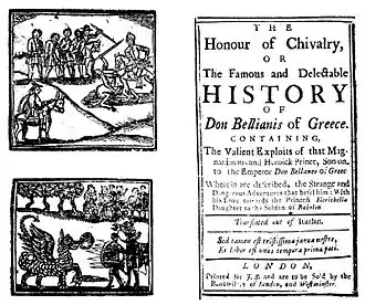 1. ^ Fernández, J. (1703). The honour of chivalry: or, The famous and delectable history of Don Bellianis of Greece. Containing the valiant exploits of that magnanimous and heroick prince: son unto the emperor Don Bellaneo of Greece ... Tr. out of Italian ... London: Printed for E. Tracy.