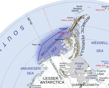 The Bellingshausen Sea is an area along the west side of the Antarctic Peninsula between 57°18'W and 102°20'W, west of Alexander Island, east of Cape Flying Fish on Thurston Island, and south of Peter I Island (there the southern Vostokkysten).[1] The Bellingshausen Sea borders the Eights Coast, the Bryan Coast, and the west part of the English Coast in Antarctica. To the west of Cape Flying Fish it joins the Amundsen Sea.