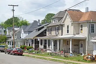 The majority of the houses in the district were built within the first two decades of its existence.[3] The earliest, generally closest to the railroad, were typically single-family homes of frame construction in the Folk Victorian style, though some higher ranked N&W employees built grander homes of Queen Anne and Colonial Revival.[3] The 1917 opening of the American Viscose Plant on the southern end of 9th Street brought a second wave of construction to the district.[3] These houses were often built as infill on vacant lots and were primarily of the American Foursquare and American Craftsman styles.[3]