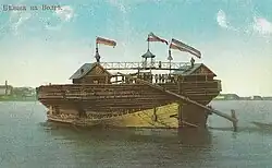 Frequent destinations for belyanas were Saratov, Tsaritsyn (today's Volgograd), and Astrakhan, where the timber and hull were dismantled for firewood or went to sawmills for final processing.[15][17] The boats' cabins were sold as ready-made houses.[11] Belyanas did not go further than Astrakhan on the Caspian Sea. Only the smallest belyanas, loaded with fish in Astrakhan, went back, pulled upstream by burlaks.[2] Maintaining a vessel for more than one season was unprofitable. In particularly active years, up to 60 to 150 belyanas sailed the Volga.[15][1] The value of a belyana could be between 100,000[15] and 150,000 rubles (c. 1910).[17]