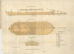 The floating of belyana required special skills. There were no sails, and boatmen labor was not used. The pilot, who drove the belyana, had to perfectly know the river and the vessel. For this reason, the pilot was present during the construction phase, as all belyanas were individually built. The control was carried out with a huge rudder placed in the stern, which was rotated by means of a large, long and thick rod, taken out of the stern of the deck. For this reason the vessel moved not with the nose forward, but with the stern, in order to provide an ability to operate with a lot—a round iron casting with the "ear" for tying the rope with—that should always be dragged behind the vessel.[1][15][18] To control the rudder, two iron lots, a riskovy (swivel) anchor and parking anchor were used.[19] The right lot was bigger, weighing between 3200 and 4000 kg for large belyanas and 2400 to 3200 for smaller ones, the left lot was smaller, weighing between 2880 and 3200 kg for large and 1600 and 2400 kg for small vessels.[19][20] The rudder at the vessel can be effective in cases when the ship speed is less than the flow rate or exceeds the latter. To adjust the speed of the ship and maneuver, two lots were lowered into the water from both sides of the vessel. If both lots simultaneously touched the bottom, the motion of the belyana was stopped. If the right lot was lifted off the bottom, the belyana turned left; if the left one was lifted, it turned right. The riskovy anchor was used at very tight turns.[1][15][18]