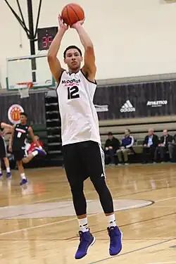 On 12 November 2014, Simmons signed a National Letter of Intent to play college basketball for LSU.[26] On 28 January 2015, Simmons was named as a starter for the East team to compete in the 38th annual McDonald's All-American Game.[29][30] On 10 March 2015, he was named the Morgan Wootten Award winner, given annually to the best male McDonald's All-American player who exemplifies outstanding character, exhibits leadership, and embodies the values of being a student-athlete in the classroom and in the community.[31] He was then named the Naismith Prep Player of the Year on 12 March[32] and the Gatorade National Player of the Year on 24 March after leading the Eagles to a 28–1 record and a berth in the High School National Tournament for the third straight year.[33] In 29 regular season games, he averaged 28.0 points, 11.9 rebounds, 4.0 assists, and 2.6 steals per game while shooting 70.7 percent from the field and recording 24 double-doubles.[33]