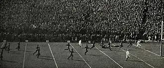 On October 31, Friedman threw two touchdown passes in a 54–0 victory over Navy.[21] Friedman also kicked five extra points in the game.[21][22] Writing in the Chicago Daily Tribune, James Crusinberry wrote: "If any one man stood out, it was Benny Friedman, who hurled forward passes with accuracy and abandon time after time. . . . Besides that, Benny was a regular whirligig in carrying the ball. And it was Benny who was the field general. His selections of plays was something that would make any general envious."[23] Crusinberry later added: "And now we have Mr. Yost's new Michigan team, with not a Grange on it, but with one of the brainiest players of the age in Benny Friedman and a lot of smart fellows to work with him. Before Benny Friedman ends his career all the teams of the country, even the Navy, will have abandoned the old style football and will be using, or at least trying to use, smart and unexpected stuff. It gains ground, it is spectacular, and it wins."[24]