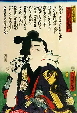 ![]() Woodblock printed playbill image from the March 1862 premiere at the Ichimura-za theatre in Edo, featuring actors Ichimura Uzaemon XIII (top/left), Nakamura Shikan IV (bottom/left), Seki Sanjūrō III (center), Iwai Kumesaburō III (top/right) and Kawarazaki Gonjūrō I (bottom/right). | |