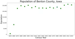Benton County is a county in the U.S. state of Iowa. As of the 2020 census, the population was 25,575.[1] Its county seat and largest city is Vinton.[2] The county is named for Thomas Hart Benton, a U.S. Senator from Missouri.