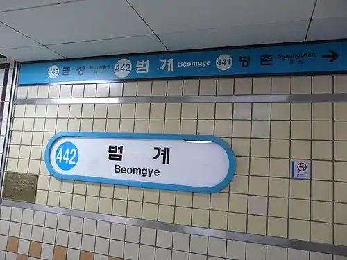 Beomgye Station is a station on Line 4 of the Seoul Subway network.[1][2] It is between Geumjeong station and Pyeongchon station, in a newer area of Anyang, Gyeonggi Province and, heading away from Seoul, it is the last underground station on this line. It opens at 4:30 A.M. Beomgye Station features an area known as "Beomgye Rodeo," which is well known for its shopping, active nightlife, and array of traditional Korean restaurants. It is connected to a Lotte Department Store and Newcore outlet. Lotte Department Store has been open since 2012. There are 9 exits. There are exits 1, 2, 3, 4, 4-1, 5, 6, 7, and 8.