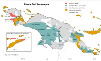 The Berau Gulf languages form a high-level branch of the Trans–New Guinea language family in the classification of Timothy Usher.[1] They are spoken along the coasts of the Berau Gulf of western New Guinea (southwestern coast of the Bird's Head Peninsula, the northern coast of the Bomberai Peninsula and the entirety of the Fakfak Peninsula), as well as the islands of Timor (primarily East Timor), Alor and Pantar further west. The constituent families are,