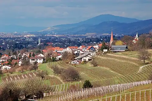 The Bergstraße district is situated along the western slopes of the Odenwald mountains in southern Hesse, Germany. Its highest point is the Melibokus, a 517-meter (1,696-foot) hill near Zwingenberg.[3] The district derives its name from the historic Bergstraße ("Mountain Road"), an 80-kilometer scenic route that runs from Darmstadt to Wiesloch, with its northern section passing through the district.[4]