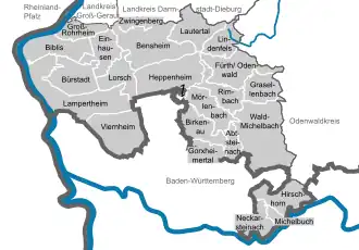 Groß-RohrheimZwingenbergBiblisViernheimLampertheimBürstadtEinhausenLorschBensheimLautertalLindenfelsHeppenheimHeppenheimFürthGrasellenbachRimbachMörlenbachWald-MichelbachBirkenauAbtsteinachGorxheimertalHirschhornNeckarsteinachMichelbuchRhineland-PalatinateBaden-WürttembergGroß-Gerau (district)Darmstadt-DieburgOdenwaldkreis
