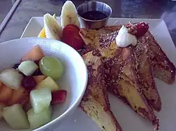 Corn bread, originating in Mexico and sweet Easter bread, originating in the British West Indies are incorporated into menus.[3] Bananas are versatile in local cuisine, and may be used to make banana crumble and desserts made from strawberries and cherries, fried as fritters, or flamed in rum.[2][8] Desserts with bananas are also baked in rum and brown sugar.[2] Jelly-roll or sponge cake, served with peaches or strawberries, bananas, custard, chopped nuts, and whipped cream and soaked in sherry is also a common dessert.[8] Another notable Bermudian dessert is the restaurant Fresco's chocolate mousse cake, which is served fresh out of the oven with roasted almonds, toffee, marshmallow ice cream, and pistachio creme.[4]