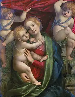 Lanini was born in Mortara, Italy.[1] He trained initially as a pupil of the painter Andrea Scotto, then worked with Pietro Perugino, and finally with Gaudenzio Ferrari.[2] He painted a Last Supper for the church San Nazaro Grande in Milan, a Holy family for the church of Sant'Ambrogio, now on display in the Brera Gallery, and the frescoes on the Life of the Magdalen for the church of San Cristoforo in Vercelli. Three of his works are on display at the Museo Francesco Borgogna in Vercelli, including an Annunciation; a Madonna and Child with Saints Bernardino of Siena and St Francis of Assisi (also labelled Madonna del cane due to dog asleep below Virgin); and a painted standard of Madonna and Child with St Anne and hooded confraternity brothers, painted for the Confraternita di Sant'Anna. Lanini painted a St Catherine for the church San Celso. He frescoed sibyls for the Novara Cathedral. He also painted for a chapel in the Basilica of San Magno, Legnano. Other paintings are in Saronno.